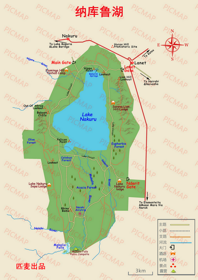 纳库鲁湖国家公园内只有三家永久性住地,和一处季节性帐篷酒店。这些酒店中,性价比最高的是 Flamingo Hill Camp,最奢华的是季节性帐篷酒店Lakira Camp(位于东岸,暂未标出),淡季入住最划算的是Sarova Lion hill Lodge。